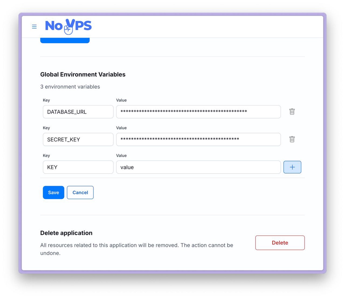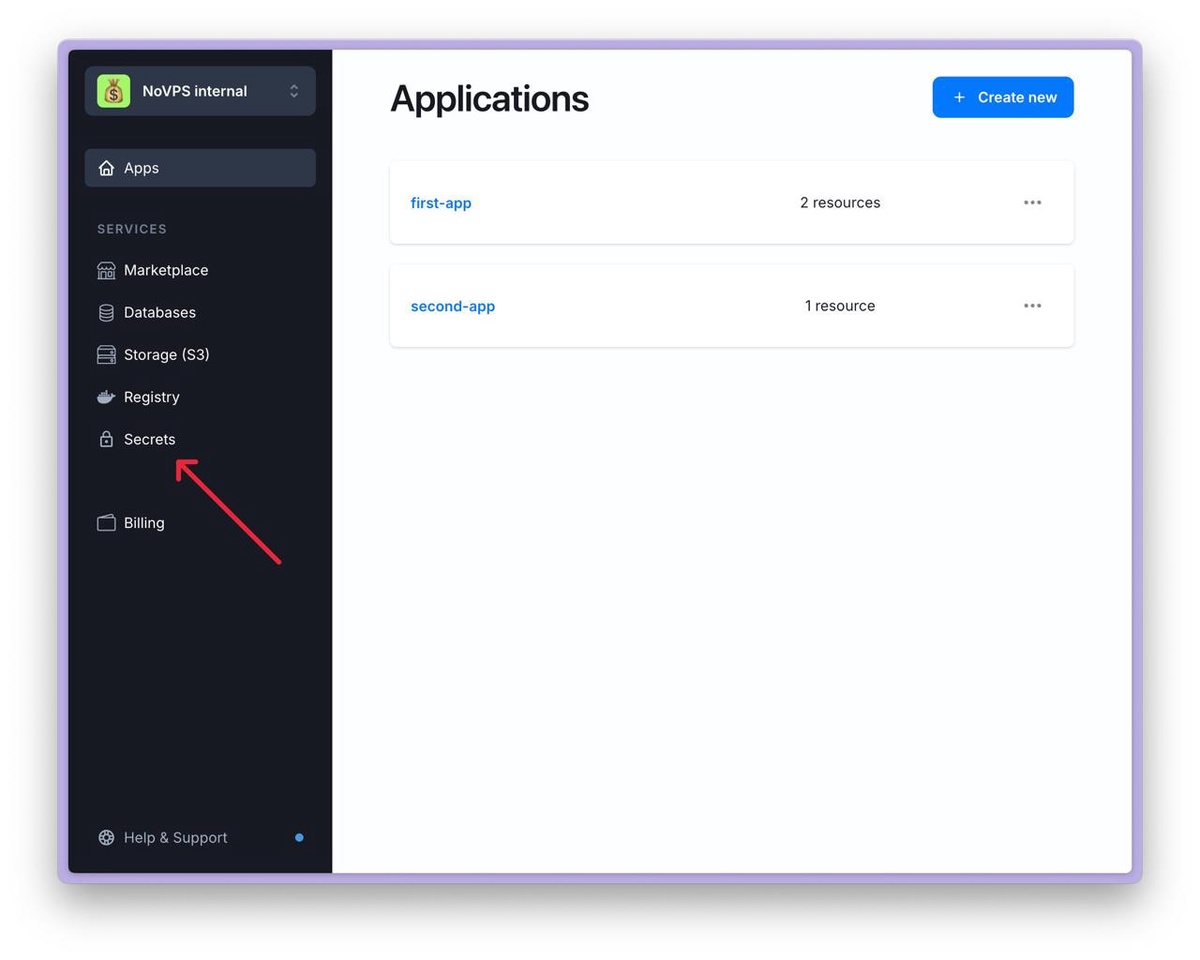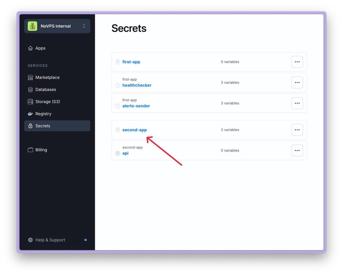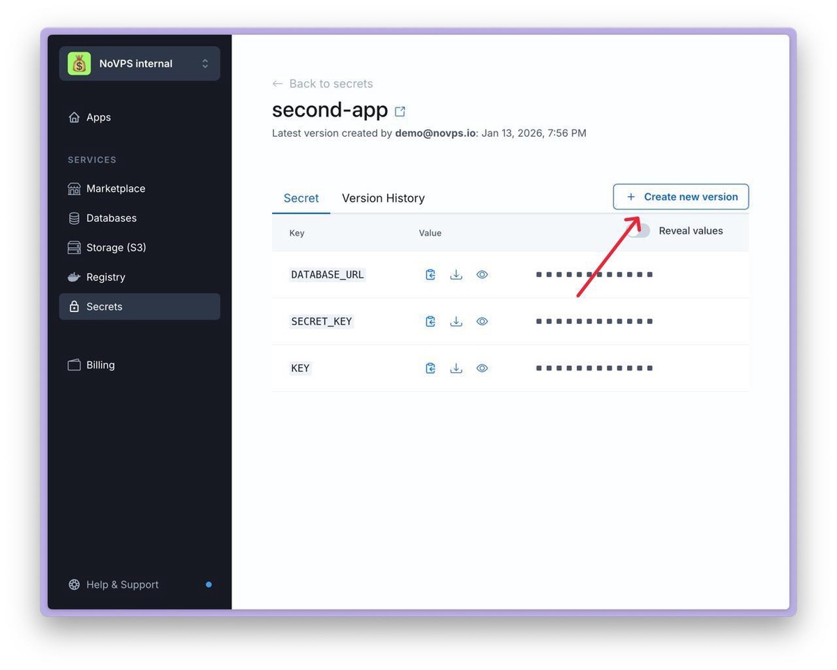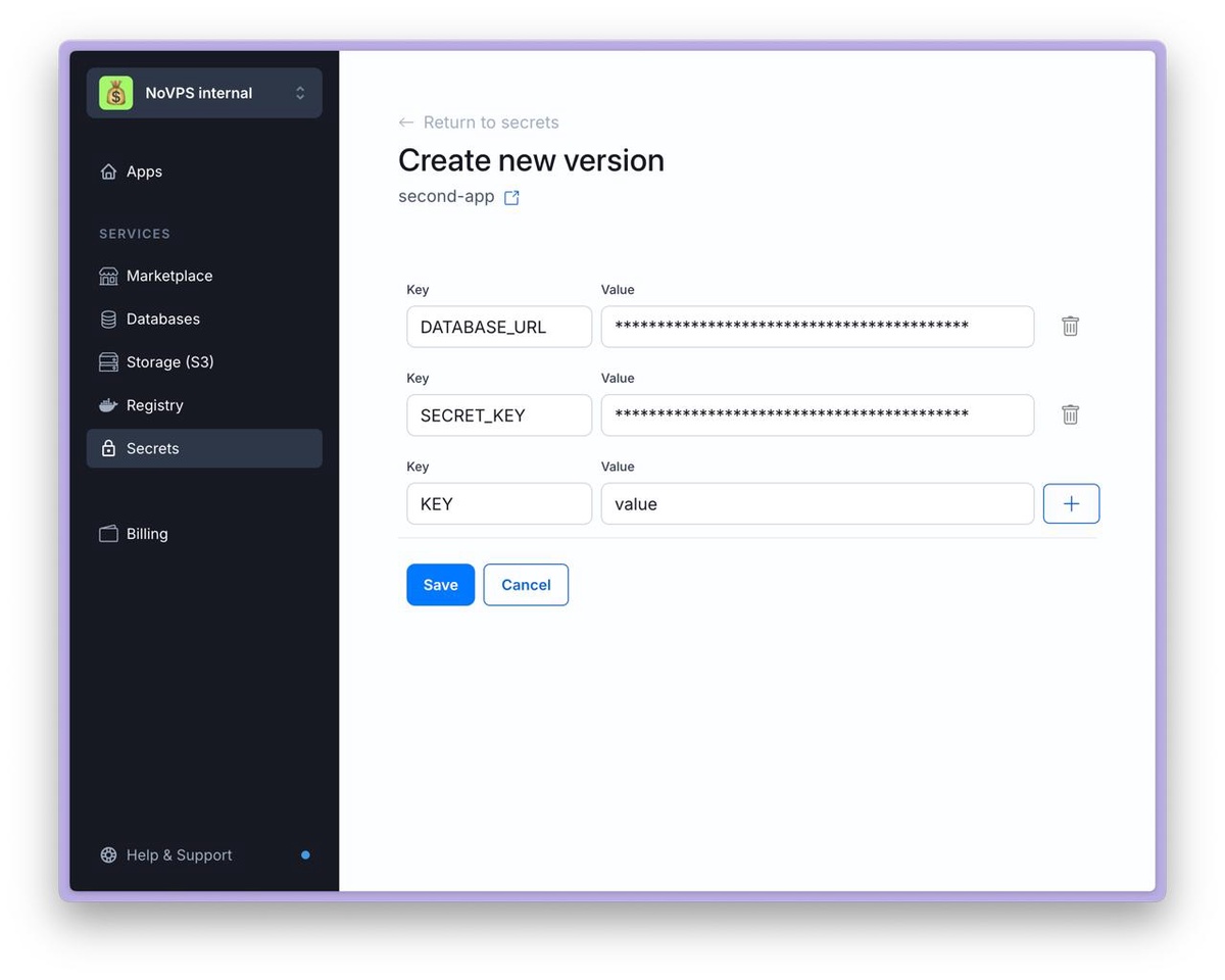 A more convenient way to manage environment variables is to use the NoVPS Secrets feature. The advantage of this approach is that it provides a history of changes and the ability to quickly roll back to a previous version of the settings at any time.