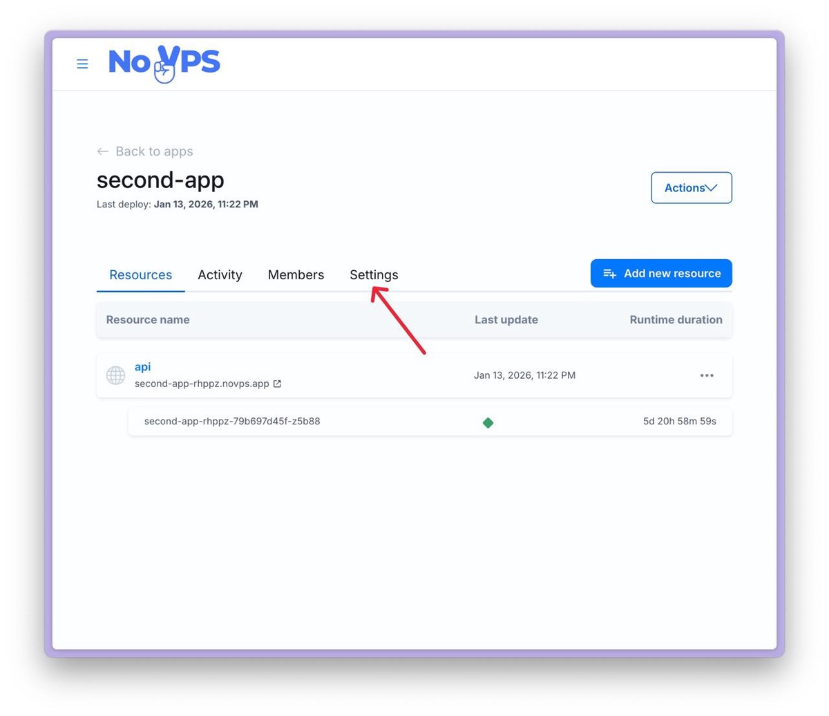 2. The application page will open, displaying a list of running resources and tabs that allow you to switch between sections. Click on the settings tab.