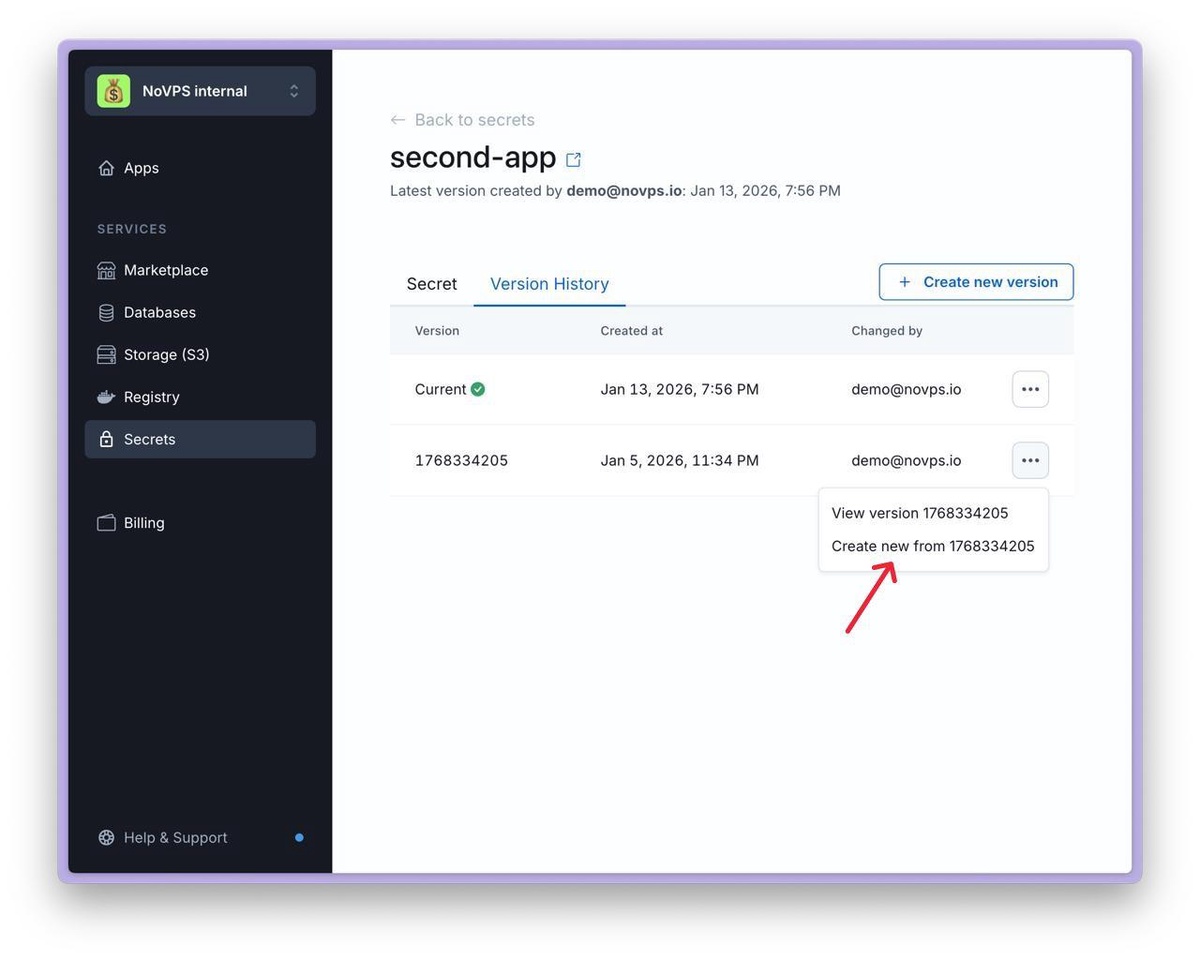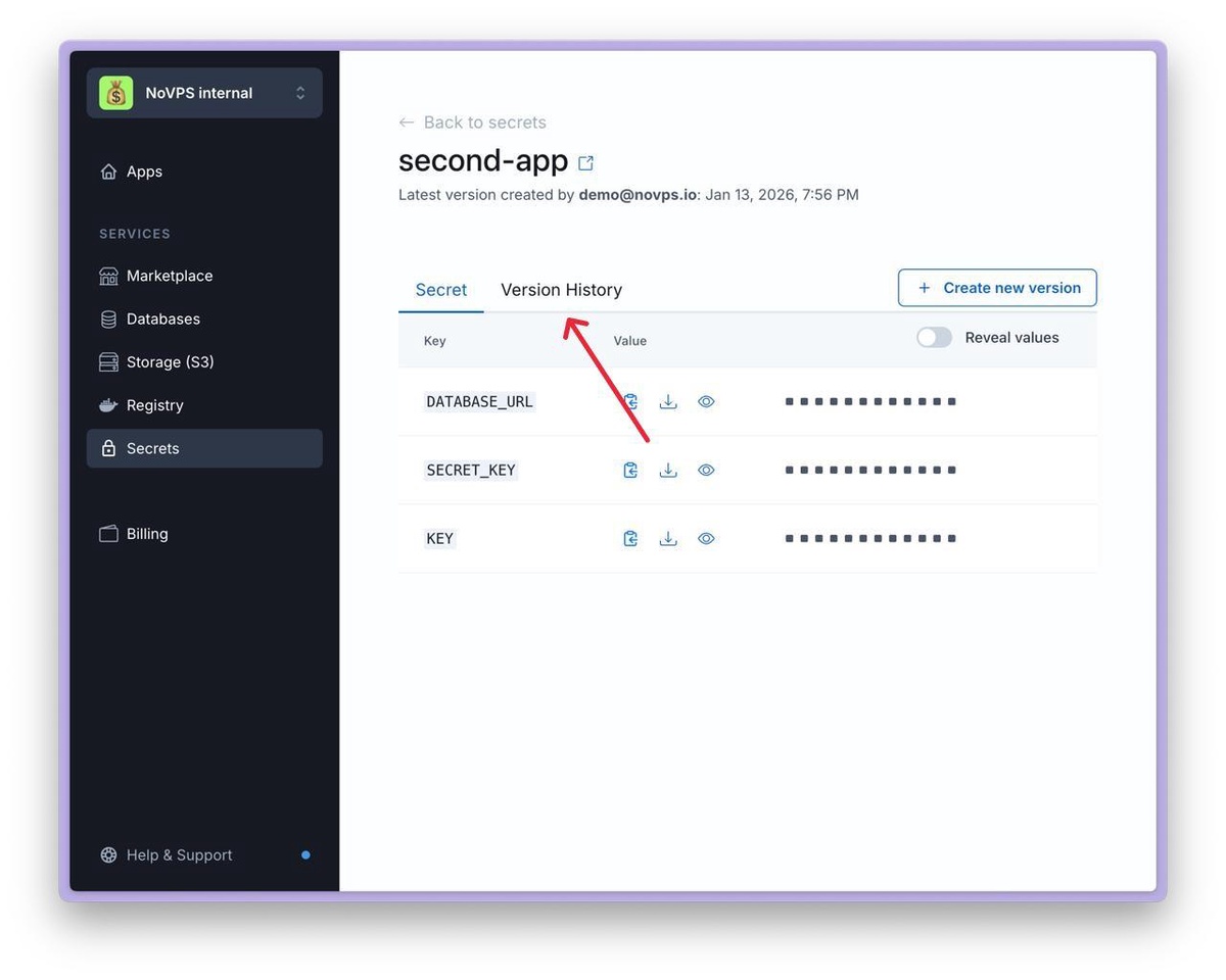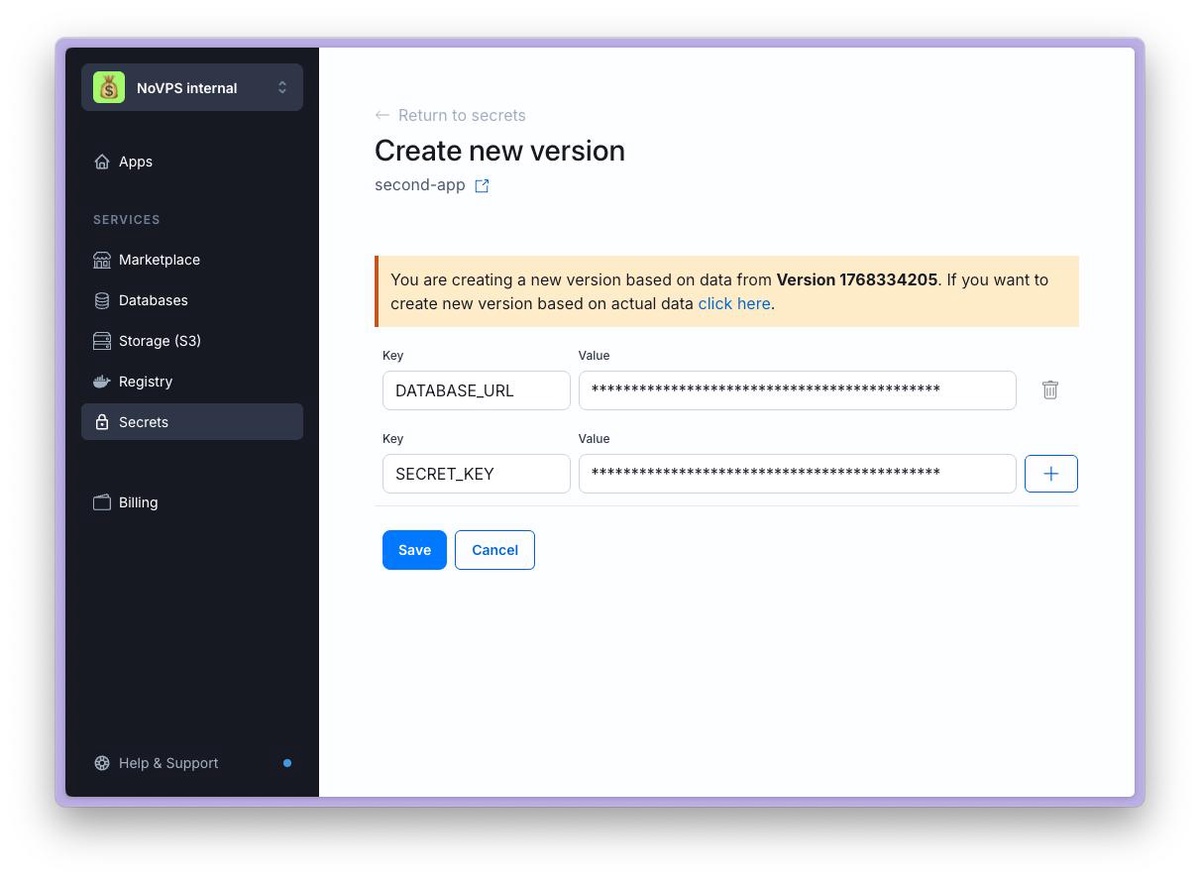 Let's say you have two applications running. You made a mistake when configuring one of them and now want to roll back to the previous version of the environment variables. The NoVPS cloud platform provides versioning of environment variables, allowing you to easily roll back to the desired version.