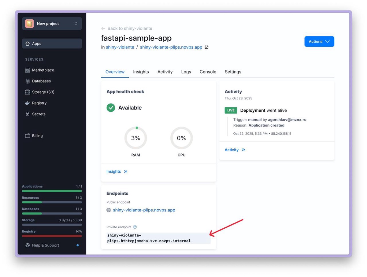 Applications are collections of resources that combine various services within a single scope. Suppose you have a website that requires a web server, queue worker, and several cron commands to run. In this case, you create a new application in NoVPS, within which you create several resources: a web service for the website, a worker for queue workers, and a cron job for each cron command.
